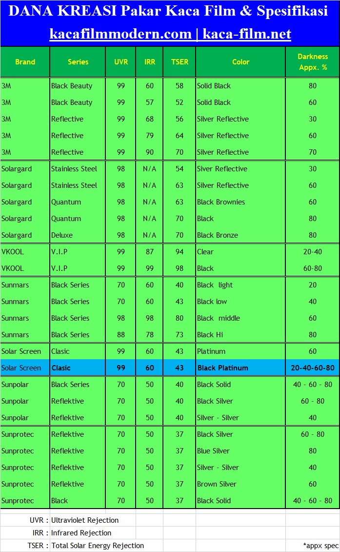 Berikut terlampir beberapa kumpulan Spesifikasi Kaca film sebagai bahan perbandingan untuk mengetahui lebih jauh akan performa yang diberikan oleh berbagai merk Kaca film.